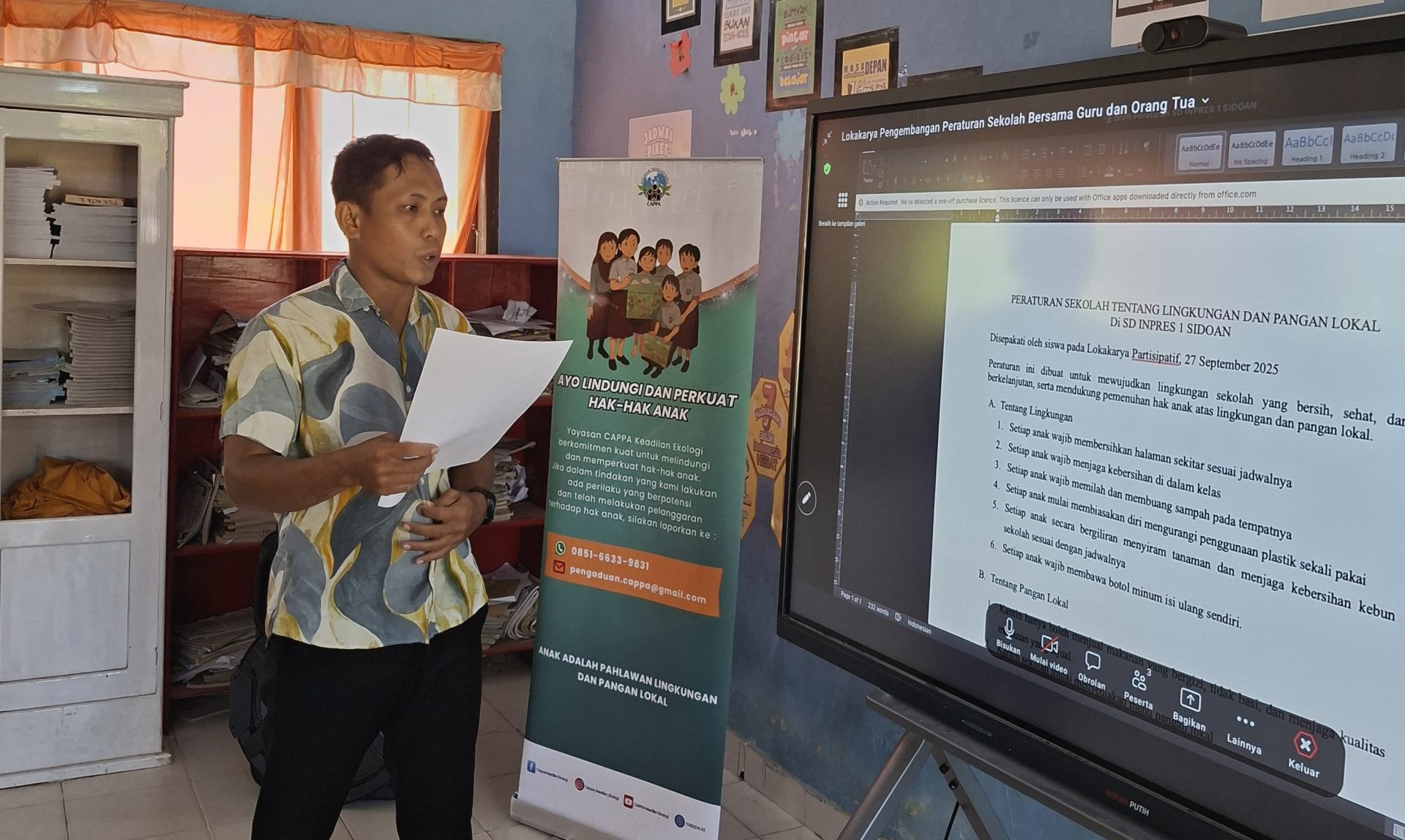 Kegiatan lokakarya dilaksanakan selama satu hari secara hybrid (offline dan online) di SD Inpres 1 Sidoan. Proses kegiatan diawali dengan pembukaan dan penyampaian tujuan lokakarya oleh fasilitator. Fasilitator juga menyampaikan poin-poin dari draf peraturan sekolah yang sebelumnya sudah disusun oleh anak-anak kepada guru dan orang tua. Selanjutnya, fasilitator membuka ruang pertanyaan bagi guru dan orang tua jika ada yang masih ingin menanyakan tentang kegiatan yang akan dilaksanakan.